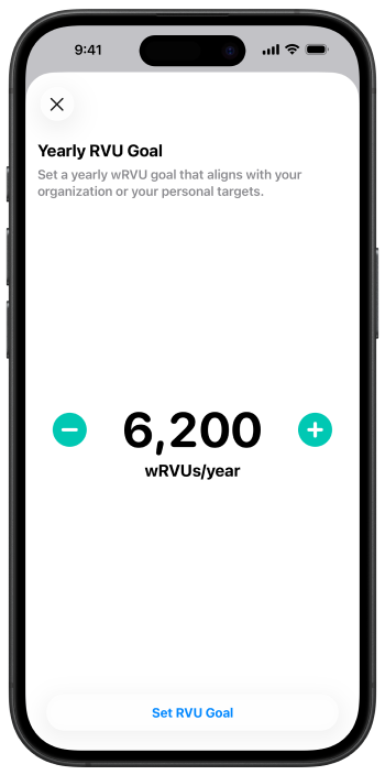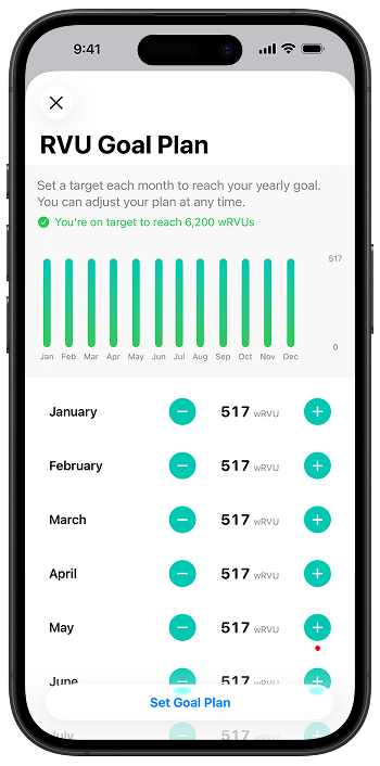 Put a number to your yearly RVU Goal and plan your monthly targets so RVU Wallet is configured to match your contract or personal goals.